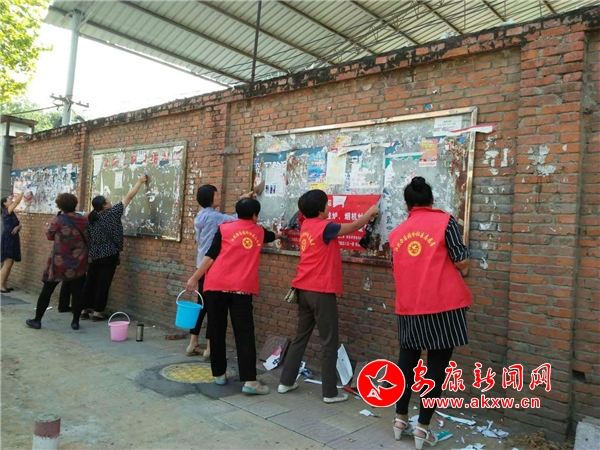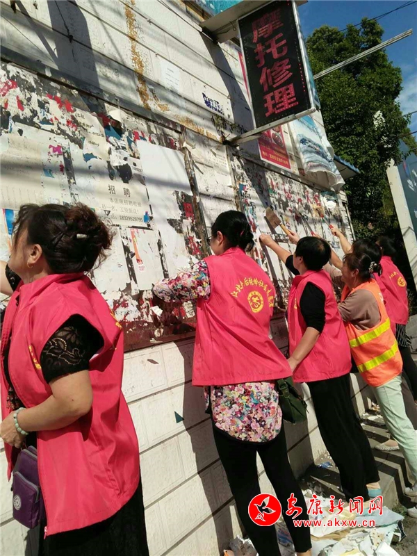 后張嶺社區(qū)組織志愿者、低保戶和保潔員對轄區(qū)的小野廣告進行集中清理。