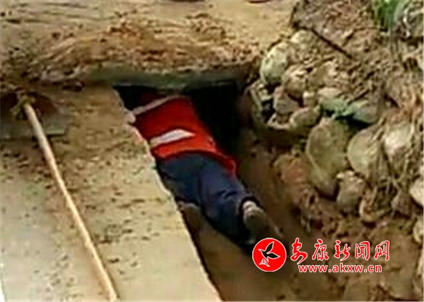 蓋板蓋住的水溝部分形成一個寬約80公分的狹小涵洞,鐵鍬只能鏟出洞口的淤泥雜物,里面的怎么辦?“我身體瘦小,我來!”——道班職工鄭清學(xué)主動請纓,用洋鎬頭一點(diǎn)點(diǎn)將污物往外掏。遇到挖不到的角落,他便用雙手代替作業(yè),每清理完一部分,他就匍匐前進(jìn)一點(diǎn),整個身子緊緊貼在溝底,全然不顧臉上、身上滿是厚厚的淤泥。