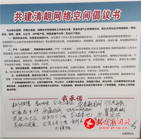 會(huì)議組織傳達(dá)學(xué)習(xí)了省市輿論環(huán)境集中整治專(zhuān)項(xiàng)行動(dòng)工作會(huì)議精神;市公安局、市文廣局就網(wǎng)絡(luò)輿論環(huán)境整治工作做了匯報(bào)發(fā)言;與會(huì)人員共同發(fā)起并簽訂了《共建安康清朗網(wǎng)絡(luò)空間倡議書(shū)》;5家網(wǎng)絡(luò)媒體及平臺(tái)代表圍“繞弘揚(yáng)主旋律、傳播正能量,營(yíng)造清朗網(wǎng)絡(luò)空間”進(jìn)行了表態(tài)發(fā)言。