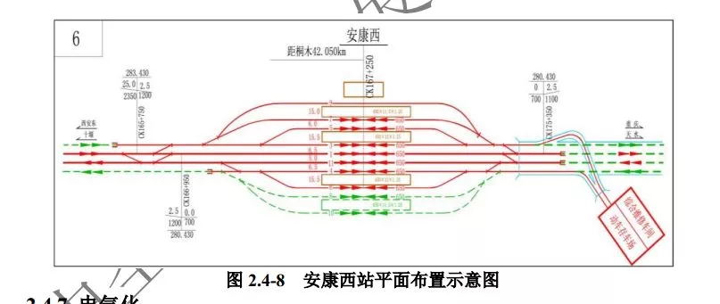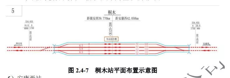 車站初始規(guī)3臺8線布置,遠期隨天水一十堰鐵路引入預(yù)留1臺2線(PS:另一條高鐵過境安康,美),總規(guī)模4臺10線。到發(fā)線有效長650m,設(shè)島式站臺(450×12×1.25m)4座,設(shè)旅客進出站地道2座(寬12m)。