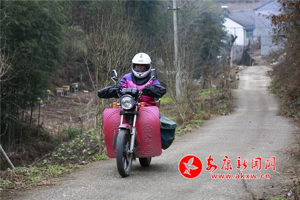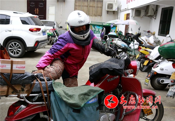 新春之際,陜南天氣依然寒冷。趙明翠戴上頭盔,捆綁好厚厚的護(hù)膝,艱難得跨上摩托車,點火起步出發(fā),開始了一天的投遞工作。記者驅(qū)車緊跟隨其后,在很多拐彎和上下坡路段,我們看到趙明翠為了平衡摩托車,經(jīng)常是兩腳尖著地。