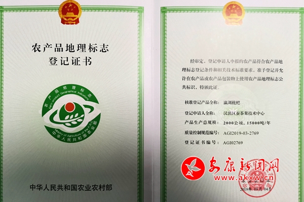 日前,農業(yè)農村部發(fā)布公告,漢濱區(qū)農業(yè)農村局蠶茶果技術中心申報的“瀛湖枇杷”經(jīng)過初審、專家評審和公示,符合農產(chǎn)品地理標志登記條件和相關技術標準要求,準予登記,特頒發(fā)中華人民共和國農產(chǎn)品地理標志登記證書。