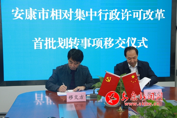 交接會(huì)上,市行政審批服務(wù)局宣讀了《市政府辦公室關(guān)于啟用安康市行政審批服務(wù)局行政審批專(zhuān)用章的通知》。市行政審批服務(wù)局相關(guān)領(lǐng)導(dǎo)分別與市場(chǎng)監(jiān)管、交通運(yùn)輸、衛(wèi)健、教育、司法等5部門(mén)負(fù)責(zé)人就94項(xiàng)行政許可事項(xiàng)簽訂劃轉(zhuǎn)移交協(xié)議,進(jìn)一步明確了移交內(nèi)容、移交程序、工作要求。