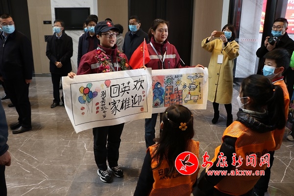 在高新國際會議中心大門入口的臺階上,三所市級醫(yī)院的醫(yī)護人員、市民群眾列起長隊,喊著口號,夾道歡迎英雄回家。進入大廳,孩子們紛紛獻上自己的畫作,表達對援鄂英雄的敬意。