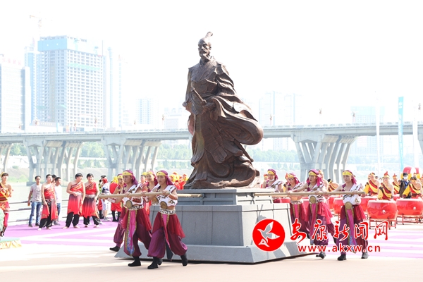 “緬懷先賢”隨著主祭官一聲令下,百名少年兒童方陣,著漢服,持竹簡,緩緩步入舞臺,在悠揚(yáng)婉轉(zhuǎn)的古箏聲中,齊聲吟誦祭文。在全場目光的注視下,愛國詩人屈原塑像被九位壯漢護(hù)送至舞臺正中。在主祭官的引導(dǎo)下,眾人向屈原塑像鞠躬叩首,并將粽子投入江中,以示對先賢的敬畏與追思。
