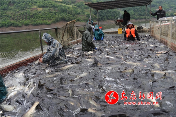 2018年,嵐皋縣嵐翠湖生態(tài)漁業(yè)開發(fā)有限公司利用藺河庫區(qū)6500余畝水面,探索發(fā)展大水面生態(tài)漁業(yè),實施“人放天養(yǎng)”、集中捕撈,取得了保護水質(zhì)、生態(tài)富民的環(huán)境效益雙贏,初步實現(xiàn)了“以水養(yǎng)魚、以魚凈水”的良性循環(huán)。該公司總經(jīng)理李強告訴記者,同樣大小的魚苗同樣方式養(yǎng)到同樣重,外邊有些地方只需要四五個月,而我們這兒需要八九個月,但是我們的魚品質(zhì)上乘。公司負責人周偉介紹,大水面放養(yǎng)的魚好賣,幾萬斤魚到了成都水產(chǎn)批發(fā)市場被商家一搶而空,都夸贊嵐皋的魚好,肉質(zhì)鮮美,好吃夠味,生態(tài)自然。