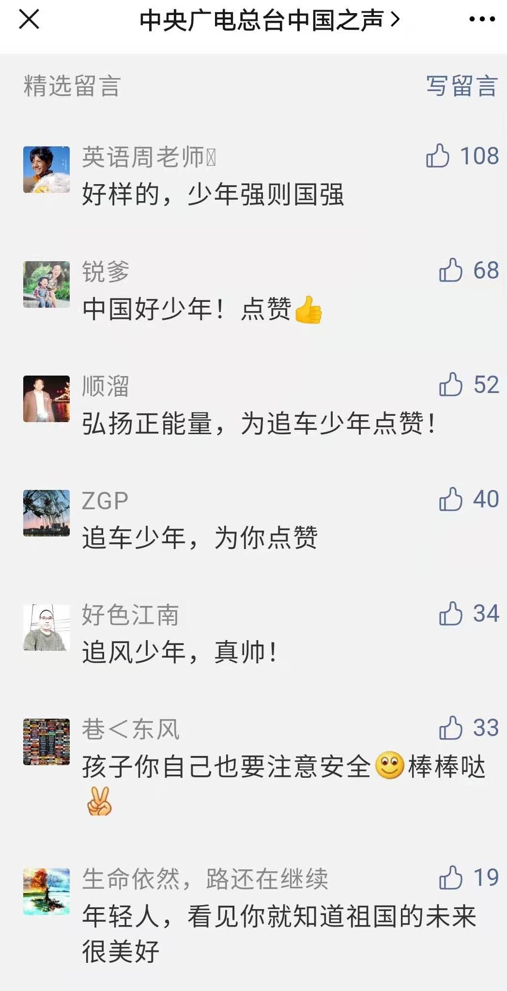 新華網、央視新聞、中央廣電總臺中國之聲等多家央媒關注報道安康這名“追車少年”,贊揚他的善行義舉,網友紛紛留言:“少年強則國強”,“看到你就知道祖國的未來很美好”……