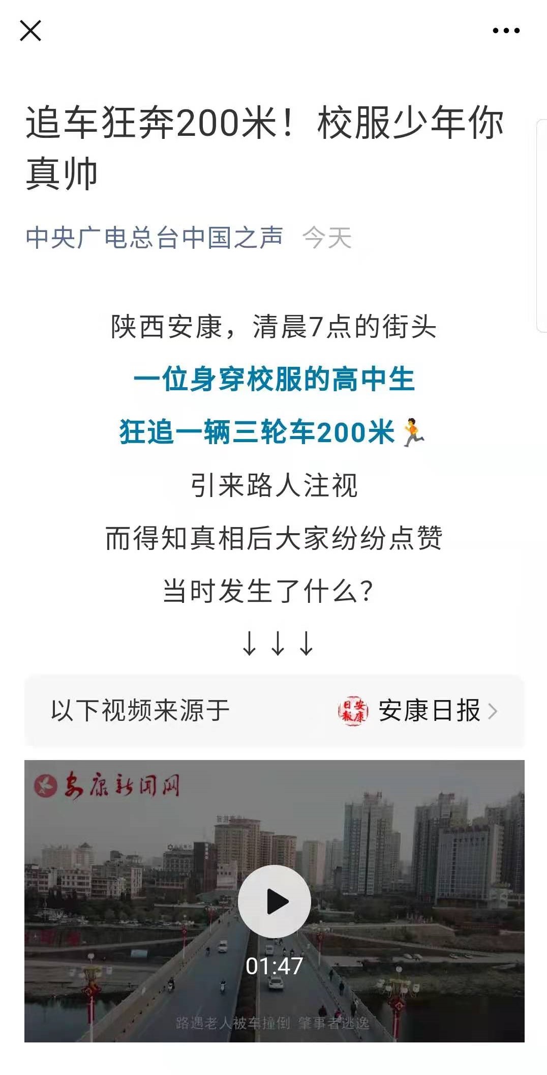 新聞鏈接:奮勇追攔肇事車 緊急救助受傷者 安康學子見義勇為顯擔當