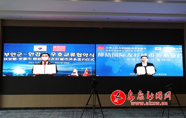 本網(wǎng)訊(記者 艾蓓 通訊員 梁石)4月28日,“中華人民共和國陜西省安康市和大韓民國全羅北道扶安郡締結(jié)國際友好城市關(guān)系簽約儀式”通過互聯(lián)網(wǎng)線上舉行,兩地正式簽署建立國際友好城市關(guān)系協(xié)議書。市長趙俊民、市人大常委會(huì)副主任周永鑫、市政府秘書長陳伍文,扶安郡郡守權(quán)翼鉉、扶安郡議會(huì)議長文燦奇等嘉賓分別在兩地出席簽約儀式,中國駐韓國光州總領(lǐng)事張承剛應(yīng)邀參加活動(dòng)。