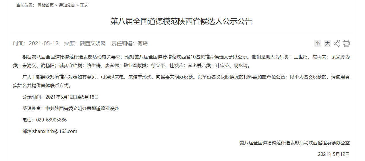 5月12日,陜西文明網(wǎng)發(fā)布第八屆全國(guó)道德模范陜西省候選人公示公告,對(duì)第八屆全國(guó)道德模范陜西省10名擬推薦候選人予以公示,我市旬陽(yáng)縣居民朱海義入選見義勇為候選人名單。
