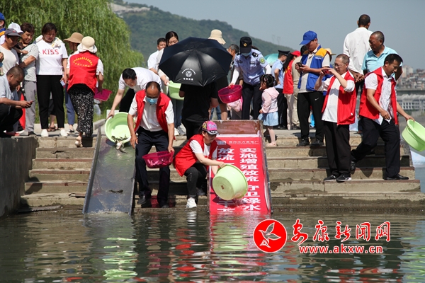 本網(wǎng)訊(記者 唐波)6月6日是農(nóng)業(yè)農(nóng)村部確定的“全國(guó)放魚日”,當(dāng)日上午,省農(nóng)業(yè)農(nóng)村廳在旬陽縣海事碼頭舉行2021年“全國(guó)放魚日”陜西省魚類增殖放流活動(dòng)啟動(dòng)儀式。省農(nóng)業(yè)農(nóng)村廳二級(jí)巡視員鄭蕓瑄宣布活動(dòng)啟動(dòng),市政協(xié)副主席、旬陽縣委書記梁濤致辭。
