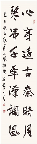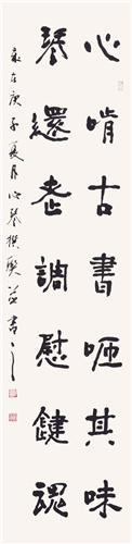 其中以書(shū)法進(jìn)益尤快, 在趙心琴看來(lái),畫(huà)家必須勤習(xí)書(shū)法,她認(rèn)為好的書(shū)法必須出于情理之中、法度之外,性情中人的她書(shū)法也是性情之作,常常隨著性情表達(dá)自己的心境。她可以從行書(shū)中求變化,楷書(shū)中找活潑,在隸書(shū)中也不墨守成規(guī),重視臨摹但不拘泥于過(guò)去的范本,每一幅書(shū)法作品都是自己針對(duì)不同的主體作出的創(chuàng)作,每幅作品都求新求變。同時(shí)她認(rèn)為稱心的國(guó)畫(huà)作品必須把好題款這道關(guān),如此方才相映成輝。2012年,省圖書(shū)館舉辦陜西作家書(shū)畫(huà)展,趙心琴應(yīng)邀出席,觀展時(shí)觸景生情,三五天后,一副不忘家鄉(xiāng)養(yǎng)育恩“巴山承心志,漢水潤(rùn)琴音”的嵌名處女聯(lián)誕生了!此后,興致所致,偶有妙句成聯(lián)。再后來(lái),一發(fā)不可收,僅以她的名字“心琴”二字,前后不重復(fù),內(nèi)容不重復(fù),陸陸續(xù)續(xù)累計(jì)撰寫(xiě)了三百多副藏名聯(lián)。據(jù)趙心琴講:有時(shí)她為一字的斟酌耗費(fèi)幾天精力,甚至夜不成寐。