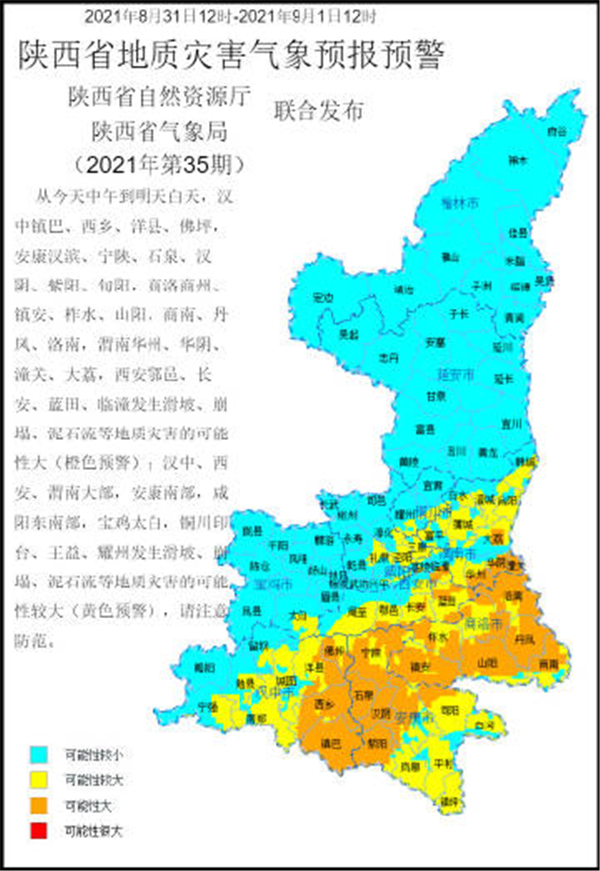 預(yù)計(jì)2021年8月31日12時(shí)至2021年9月1日12時(shí),漢中鎮(zhèn)巴、西鄉(xiāng)、洋縣、佛坪,安康漢濱、寧陜、石泉、漢陰、紫陽、旬陽,商洛商州、鎮(zhèn)安、柞水、山陽、商南、丹鳳、洛南,渭南華州、華陰、潼關(guān)、大荔,西安鄠邑、長(zhǎng)安、藍(lán)田、臨潼發(fā)生滑坡、崩塌、泥石流等地質(zhì)災(zāi)害的可能性較大(橙色預(yù)警);漢中,西安,渭南大部,安康南部,咸陽東南部,寶雞太白,銅川印臺(tái)、王益、耀州發(fā)生滑坡、崩塌、泥石流等地質(zhì)災(zāi)害的可能性較大(黃色預(yù)警),請(qǐng)注意防范。