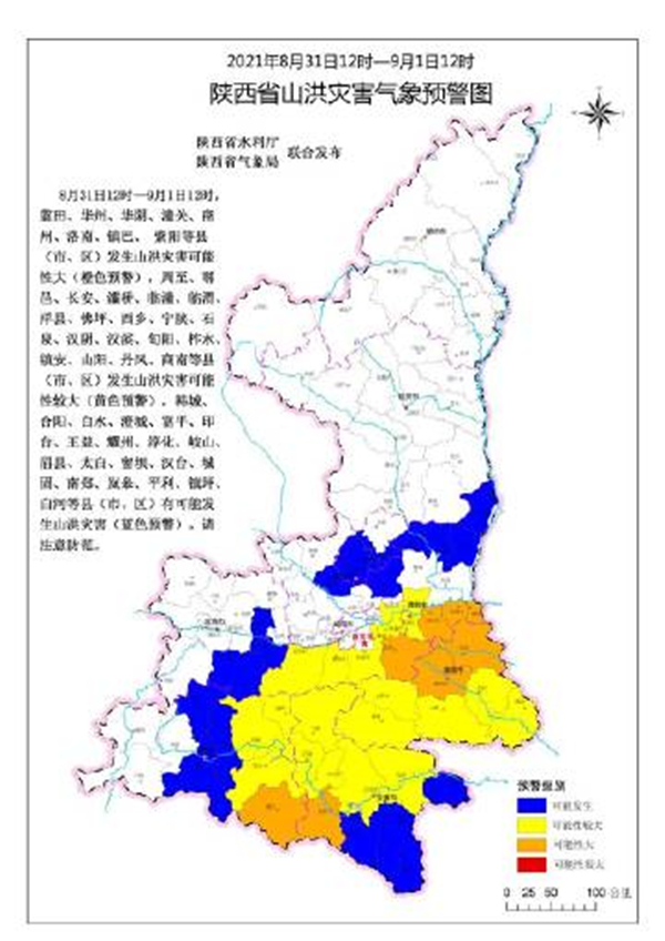 預(yù)計(jì)2021年8月31日12時(shí)至2021年9月1日12時(shí),藍(lán)田、華州、華陰、潼關(guān)、商州、洛南、鎮(zhèn)巴、紫陽等縣(市、區(qū))發(fā)生山洪災(zāi)害可能性大(橙色預(yù)警),周至、鄠邑、長(zhǎng)安、灞橋、臨潼、臨渭、洋縣、佛坪、西鄉(xiāng)、寧陜、石泉、漢陰、漢濱、旬陽、柞水、鎮(zhèn)安、山陽、丹鳳、商南等縣(市、區(qū))發(fā)生山洪災(zāi)害可能性較大(黃色預(yù)警),韓城、合陽、白水、澄城、富平、印臺(tái)、王益、耀州、淳化、岐山、眉縣、太白、留壩、漢臺(tái)、城固、南鄭、嵐皋、平利、鎮(zhèn)坪、白河等縣(市、區(qū))有可能發(fā)生山洪災(zāi)害(藍(lán)色預(yù)警)。請(qǐng)注意防范。