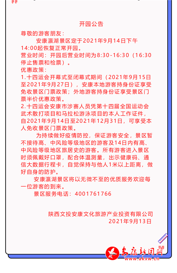 與此同時,對于十四運安康賽區(qū)涉賽人員,憑十四運本人工作證件,即日起享受游園免門票政策,免費時段持續(xù)到12月31日。