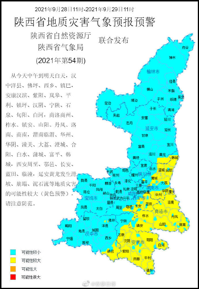 本網(wǎng)訊  陜西省自然資源廳與陜西省氣象局聯(lián)合發(fā)布地質(zhì)災(zāi)害氣象預(yù)報預(yù)警:預(yù)計9月28日11時至9月29日11時,安康漢濱、紫陽、嵐皋、平利、鎮(zhèn)坪、漢陰、寧陜、石泉、旬陽、白河發(fā)生滑坡、崩塌、泥石流等地質(zhì)災(zāi)害的可能性較大(黃色預(yù)警),注意防范。YBQ安康新聞網(wǎng)