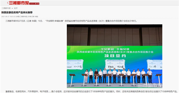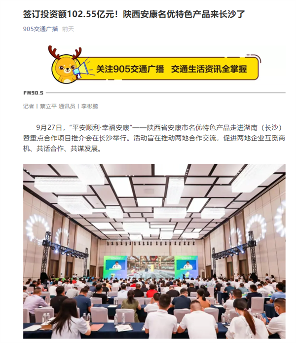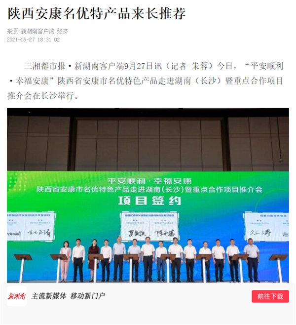 本網(wǎng)訊 9月27日,由中共安康市委、安康市人民政府,陜西省商務(wù)廳聯(lián)合主辦的“平安順利·幸福安康——陜西省安康市名優(yōu)特色產(chǎn)品走進(jìn)湖南(長(zhǎng)沙)暨重點(diǎn)合作項(xiàng)目推介會(huì)”在長(zhǎng)沙市成功舉辦。新華社、中國(guó)交通廣播、中國(guó)報(bào)道、湖南日?qǐng)?bào)、長(zhǎng)沙晚報(bào)、三湘都市報(bào)、國(guó)際在線、紅網(wǎng)等中省、長(zhǎng)沙以及駐長(zhǎng)多家媒體紛紛給予報(bào)道。媒體不僅高度贊揚(yáng)兩地的合作成果,并對(duì)安康有了一個(gè)嶄新的評(píng)價(jià)和認(rèn)識(shí)。一起看看“老親戚”長(zhǎng)沙眼中的“老鄰居”安康是什么樣!