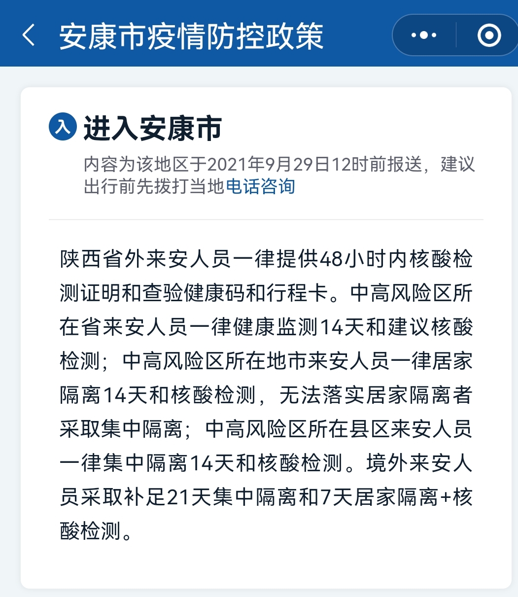另據我市最新疫情防控措施要求,陜西省外來安人員,需提供48小時內核酸檢測證明和查驗健康碼和行程卡。中高風險區(qū)所在省來安人員,需要健康監(jiān)測14天并建議核酸檢測;中高風險區(qū)所在地市來安人員,需居家隔離14天和核酸檢測,無法落實居家隔離者將采取集中隔離;中高風險區(qū)所在縣區(qū)來安人員一律集中隔離14天和核酸檢測。境外來安人員采取補足21天集中隔離和7天居家隔離+核酸檢測。