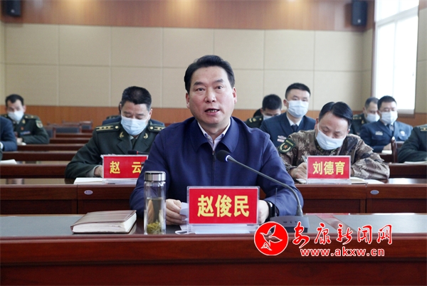 趙俊民強調(diào),要舉旗鑄魂強引領(lǐng),鞏固拓展黨史學(xué)習(xí)教育成果,持續(xù)深入學(xué)習(xí)貫徹習(xí)近平強軍思想,堅決、全面、具體、無條件地貫徹軍委主席負責(zé)制,增強“四個意識”、堅定“四個自信”、做到“兩個維護”,把堅定捍衛(wèi)“兩個確立”落實到部隊建設(shè)實踐中,確保強軍興軍始終沿著正確方向前進。要認真落實新時代黨的建設(shè)總要求,嚴格落實《中國共產(chǎn)黨軍隊黨的建設(shè)條例》《中國共產(chǎn)黨軍隊委員會(支部)工作規(guī)定》,不斷增強各級黨組織的領(lǐng)導(dǎo)力、組織力、執(zhí)行力。要練兵備戰(zhàn)提能力,堅持一切工作向能打仗、打勝仗聚焦,持續(xù)增強全民國防觀念,著力提高國防動員能力,不斷加強民兵訓(xùn)練基地和民兵隊伍建設(shè),突出抓好實戰(zhàn)化訓(xùn)練,切實做到召之即來、來之能戰(zhàn)、戰(zhàn)之必勝。
