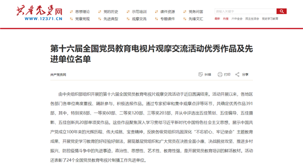 由中央組織部組織開展的第十六屆全國(guó)黨員教育電視片觀摩交流活動(dòng)近日?qǐng)A滿結(jié)束,全國(guó)共391部?jī)?yōu)秀作品和24個(gè)先進(jìn)單位獲獎(jiǎng)。