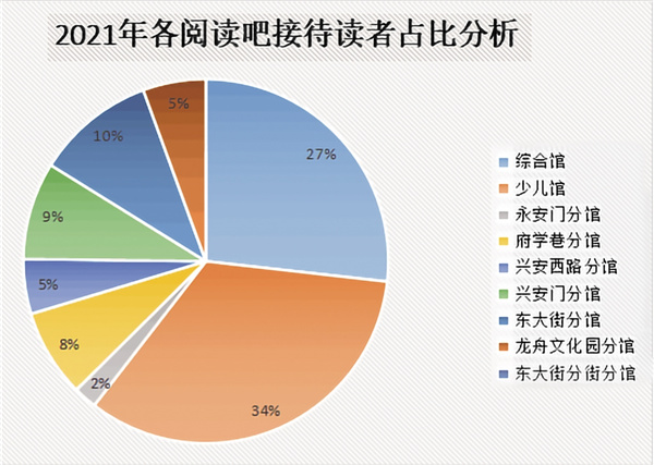 2021年,市圖書館(含各閱讀吧)共接待讀者437169人次,日均接待讀者達(dá)到1197人次。閱讀吧共計(jì)接待讀者172994人次,占全年接待讀者總?cè)藬?shù)的39%。數(shù)據(jù)表明,市圖書館正逐步成為市民閱讀、學(xué)習(xí)、交流、休閑的重要場(chǎng)所。安康閱讀吧在為讀者提供便捷閱讀的同時(shí),節(jié)約了時(shí)間成本,加快了書香安康的建設(shè)步伐。