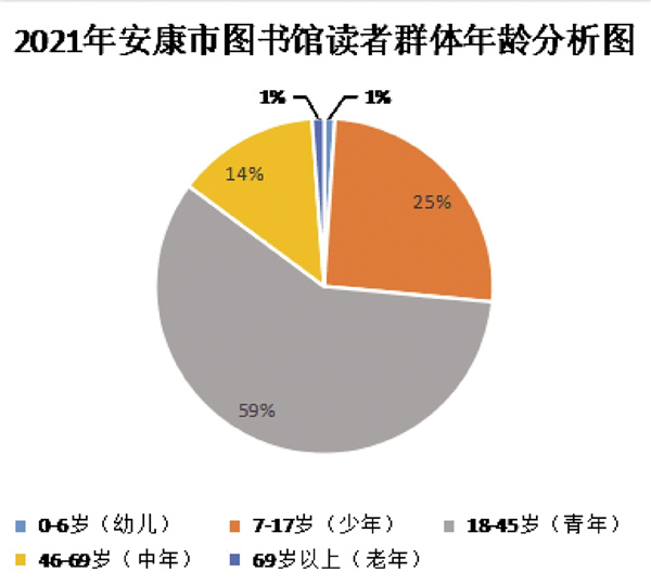 從讀者年齡段來看,市圖書館2021年有幼兒讀者(0-6歲)324人,少兒讀者(7-17歲)8098人,青年讀者(18-45歲)18686人,中年讀者(45-69歲)4347人,老年讀者(69歲以上)366人。讀者群體中青年讀者占比最大,占讀者群體的59%。少年讀者和青年讀者仍是圖書館的主要服務(wù)對(duì)象,總占比達(dá)到84%。