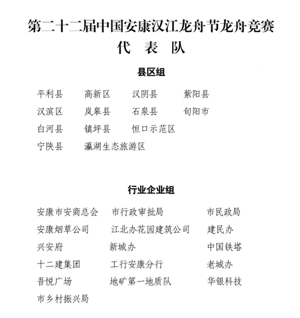 據(jù)悉,第22屆國(guó)安康漢江龍舟節(jié)龍舟競(jìng)賽將于2022年6月3日至5日,在安康城區(qū)漢江一橋至漢江三橋江面舉行,屆時(shí)各代表隊(duì)會(huì)在萬(wàn)眾矚目中劈波斬浪,一決高下。龍舟組隊(duì)包含縣區(qū)組13支、行業(yè)企業(yè)組16支,其中安康市安商總會(huì)、市行政審批局、中國(guó)鐵塔、工行安康分行、華銀科技、市鄉(xiāng)村振興局、地礦第一地質(zhì)隊(duì)7支隊(duì)伍均為首次參加。本次競(jìng)賽項(xiàng)目有3個(gè),即400米上水、800米下水、800米折返追逐賽。比賽兩個(gè)組別分設(shè)團(tuán)體獎(jiǎng)和單項(xiàng)名次獎(jiǎng),其中團(tuán)體獎(jiǎng)各組設(shè)一等獎(jiǎng)1名、二等獎(jiǎng)1名、其余均為三等獎(jiǎng),單項(xiàng)名次獎(jiǎng)分組別分項(xiàng)目各錄取前八名,根據(jù)成績(jī)名次按13、11、10、9、8、7、6、5計(jì)分,團(tuán)體獎(jiǎng)按照各單項(xiàng)獎(jiǎng)積分總和排序,獲得各獎(jiǎng)項(xiàng)的參賽隊(duì)均有相應(yīng)獎(jiǎng)勵(lì)。