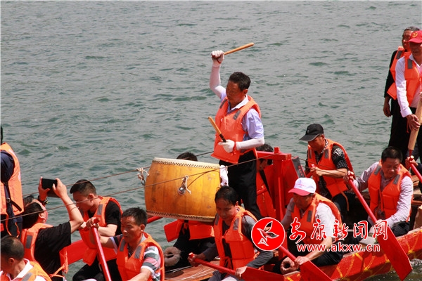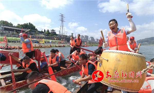 上午10時許,龍舟文化園禮炮轟鳴,數(shù)百健兒痛快地飲下“摔碗酒”,隨后依次登上自己隊伍的龍舟。紅色、黃色、紫色的龍舟整齊劃一地?吭诮,龍頭高昂,龍尾高翹,槳櫓浮動,旗幟飄揚。聞聲而來的群眾齊聚兩岸,駐足圍觀。總指揮一聲哨響,木槳齊動,龍舟似箭掠過無垠江面直逼江心,留下層層白浪;一艘艘或逆流勇進,或順流而下,或徑直橫渡,瞬間點燃觀眾激情,不時引得大家齊聲吶喊。號子聲、鑼鼓聲、吶喊聲、歡呼聲,此起彼伏,聲聲震天。隊員們跟隨著鼓點賣力地劃槳,舵手隨著龍舟行進的方向不停調(diào)整把舵,龍舟的速度不斷加快,再快,更快。