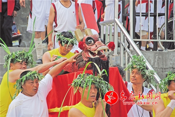 2010年6月13日,第十屆安康龍舟節(jié)開幕前一天,所有參賽船隊(duì)在西關(guān)土地廟迎接老黑龍至漢江邊,并舉行了龍舟開賽前的下水祭祀儀式。鄧軍 攝BX6安康新聞網(wǎng)