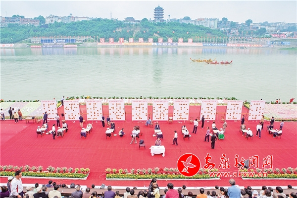 2009年第九屆安康龍舟節(jié)上,國(guó)家象棋特級(jí)大師柳大華與安康10位象棋高手進(jìn)行盲棋車輪戰(zhàn)。 邵向東 攝BX6安康新聞網(wǎng)