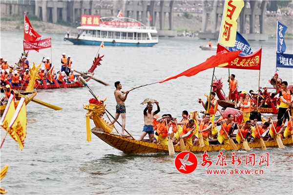 傳統(tǒng)儀式結(jié)束后,歌舞《打谷歡歌》、水岸表演《舞動漢江 活力安康》、民俗展演《向幸福出發(fā)》、新編漢劇《大美安康》、全新原創(chuàng)歌曲《端午最安康》相繼登臺,優(yōu)美的舞蹈配合婉轉(zhuǎn)唱腔,寓情于景,將傳統(tǒng)與現(xiàn)代、生活與藝術(shù)融合得恰到好處。期間還穿插進行了安康最富神采的經(jīng)典龍舟民俗項目——龍舟橫渡和搶鴨子、摸鯉魚。伴隨著震撼的鼓點聲,29支參賽龍舟隊伍的健兒們劈波斬浪,你追我趕,爭相抵達江岸。隨后,只見江面上水花飛濺,龍舟健兒們從龍舟上一躍而下,在湍急的江水中徒手捕捉浮游于江面的鴨子和鯉魚,勝利者將手中的魚兒與鴨子高高舉起,把富貴吉祥、安寧康泰的祝福送給大家。最后,第二十二屆中國安康漢江龍舟節(jié)主題活動在歌曲《hello 安康》喜悅的氛圍中圓滿落幕。k5L安康新聞網(wǎng)