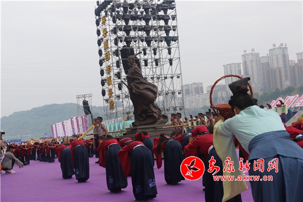 “緬懷先賢”隨著主祭官一聲令下,主題活動進入重要篇章。60名著青綠漢服女手持竹籃,伴著古琴的悠揚韻律款款走向舞臺,百名身著漢服、手持竹簡的兒童方陣緩緩步入舞臺,緊隨其后的愛國詩人屈原塑像在全場目光的注視下,被9位壯漢護送至舞臺正中。在主祭官的引導(dǎo)下,大家集體面向屈原像,百名兒童方陣齊誦祭文,清脆嘹亮的童聲如天籟般響徹云霄。“一鞠躬節(jié)分端午澤被安瀾;二鞠躬菖蒲酒美普惠蒼生;三鞠躬政善國興佑我中華。”緊接著,主祭官引導(dǎo)眾人向屈原塑像鞠躬叩首,漢服女分列兩隊,一邊把竹籃里面的粽子拋向江中,以示對先賢的敬畏與追思,一邊向臺上觀眾散發(fā)香包,以此將美好祝愿送給漢江兒女。k5L安康新聞網(wǎng)