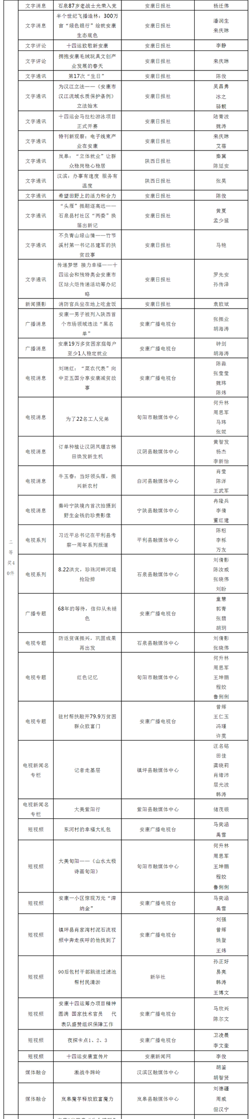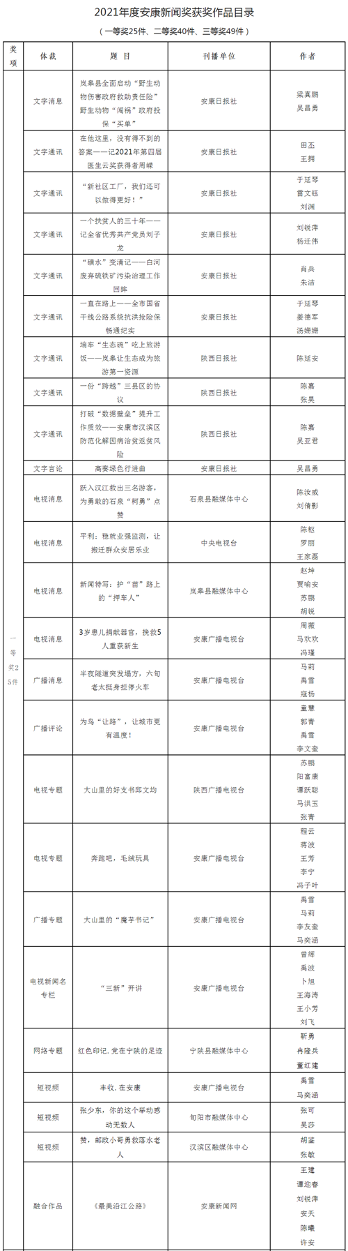 2021年度安康新聞獎(jiǎng)評(píng)審工作在中共安康市委宣傳部的指導(dǎo)下,由市記協(xié)具體組織實(shí)施,經(jīng)過(guò)各申報(bào)單位推薦,市記協(xié)初審、復(fù)審并組織專家定評(píng),評(píng)選出擬獲安康新聞獎(jiǎng)作品114件,其中一等獎(jiǎng)25件、二等獎(jiǎng)40件、三等獎(jiǎng)49件。