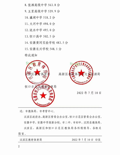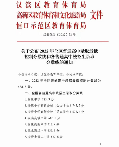 7月10日,漢濱區(qū)教育體育局、高新區(qū)教育體育和文化旅游局、恒口示范區(qū)教育體育局聯(lián)合印發(fā)文件,公布了2022年漢濱區(qū)普通高中錄取最低控制分數(shù)線和各普通高中統(tǒng)招生錄取分數(shù)線。Pwy安康新聞網(wǎng)