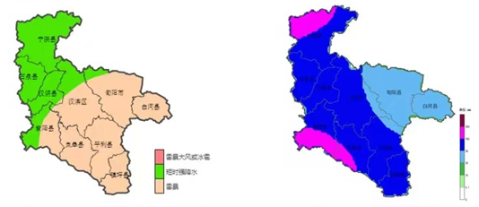 圖1:25日08時(shí)﹣26日08時(shí)強(qiáng)對(duì)流天氣落區(qū) 圖2:28日08時(shí)﹣31日08時(shí)累計(jì)降水量預(yù)報(bào)圖TrP安康新聞網(wǎng)