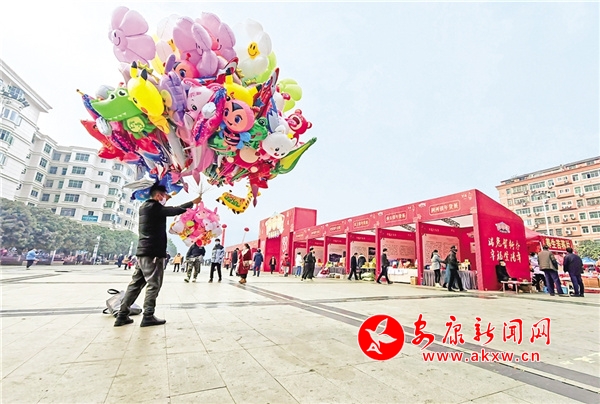 ④1月11日,“瑞兔賀新春·幸福紫陽(yáng)年”年貨節(jié)開(kāi)幕,一名商販舉著氣球前來(lái)“趕節(jié)”。