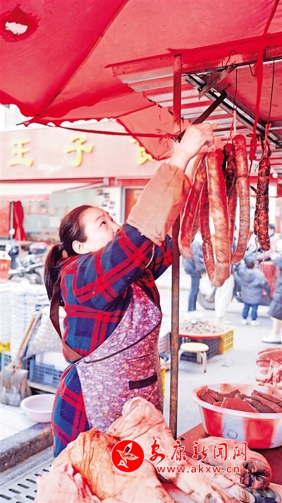 ⑩旬陽(yáng)市下菜灣商貿(mào)小區(qū)內(nèi),商販正在忙著整理臘腸。