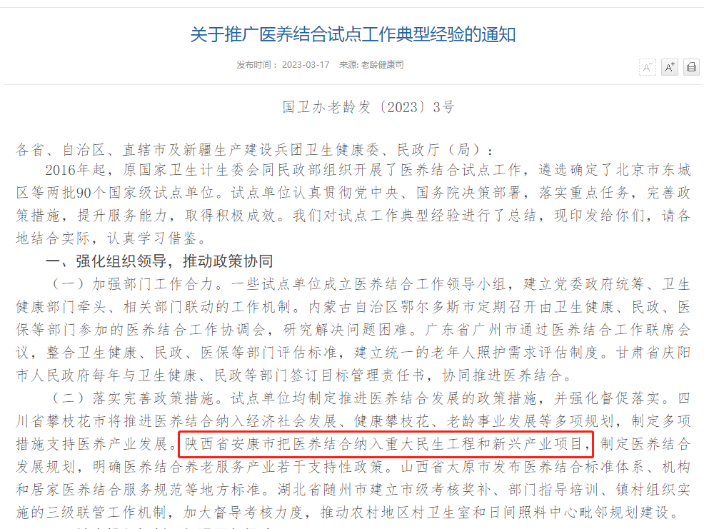 近日,國(guó)家衛(wèi)健委、民政部聯(lián)合發(fā)文推廣陜西安康市等醫(yī)養(yǎng)結(jié)合試點(diǎn)工作典型經(jīng)驗(yàn)!锻ㄖ氛J(rèn)為,試點(diǎn)期間,陜西省安康市把醫(yī)養(yǎng)結(jié)合納入重大民生工程和新興產(chǎn)業(yè)項(xiàng)目,制定醫(yī)養(yǎng)結(jié)合發(fā)展規(guī)劃,明確醫(yī)養(yǎng)結(jié)合養(yǎng)老服務(wù)產(chǎn)業(yè)若干支持性政策相關(guān)舉措取得積極成效。