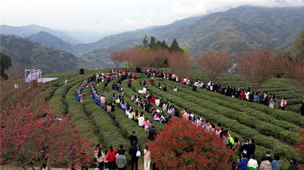 “三月三哪,上茶山喲依兒呦,姐妹采茶呀心喜歡哪,喲依兒?jiǎn),山山飄清香,處處好茶園”。3月26日,在安康市紫陽(yáng)縣向陽(yáng)鎮(zhèn)富硒茶觀光園里正在開(kāi)展“千人對(duì)歌”活動(dòng),歌聲悠揚(yáng)婉轉(zhuǎn),吸引了不少游客前來(lái)聽(tīng)民歌、賞茶園。