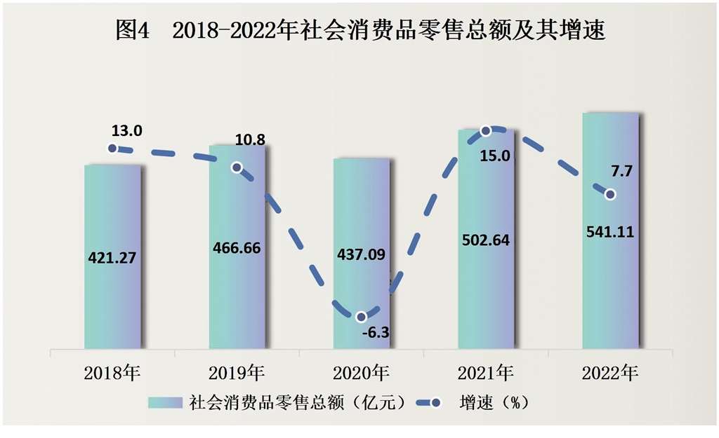 全年社會消費(fèi)品零售總額541.11億元,比上年增長7.7%。其中限額以上企業(yè)(單位)實(shí)現(xiàn)零售額330.08億元,增長12.0%。