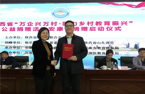 孟平代表市委、市政府向陜西省工商聯(lián)和捐贈(zèng)方表示感謝,并向格樂國際公益基金管委會(huì)頒發(fā)了榮譽(yù)證書。她在講話中指出,希望各受助學(xué)校確保設(shè)備設(shè)施功能完好、后勤保障充分有序,服務(wù)教育教學(xué)、賦能人才成長,要引導(dǎo)廣大學(xué)生大力發(fā)揚(yáng)滴水之恩、涌泉以報(bào)的反哺精神,崇文尚學(xué)、尊師重教的優(yōu)良傳統(tǒng),以實(shí)干實(shí)績書寫教育振興答卷。各級(jí)教育部門要以推進(jìn)教育強(qiáng)市為目標(biāo),用實(shí)際行動(dòng)助推教育振興;各級(jí)“萬企興萬村”行動(dòng)領(lǐng)導(dǎo)小組成員單位要廣泛動(dòng)員社會(huì)各界協(xié)同作戰(zhàn)、傾力支持,積極搭建教育捐贈(zèng)平臺(tái),引導(dǎo)大家主動(dòng)參與捐贈(zèng)行動(dòng)。