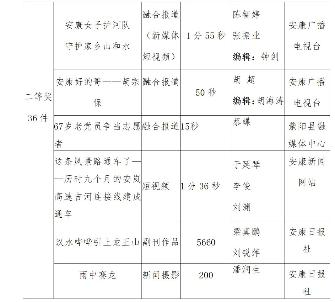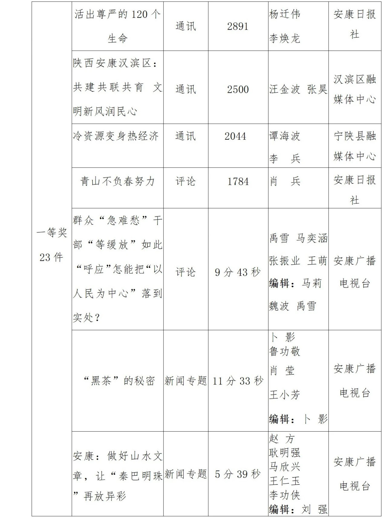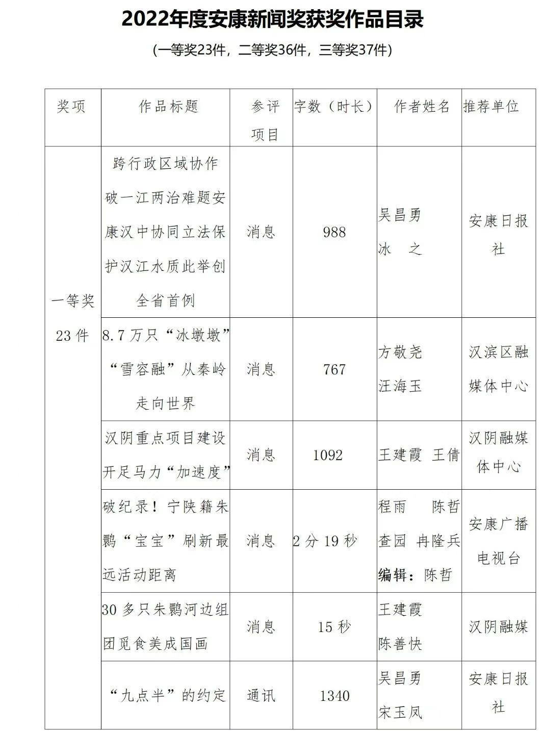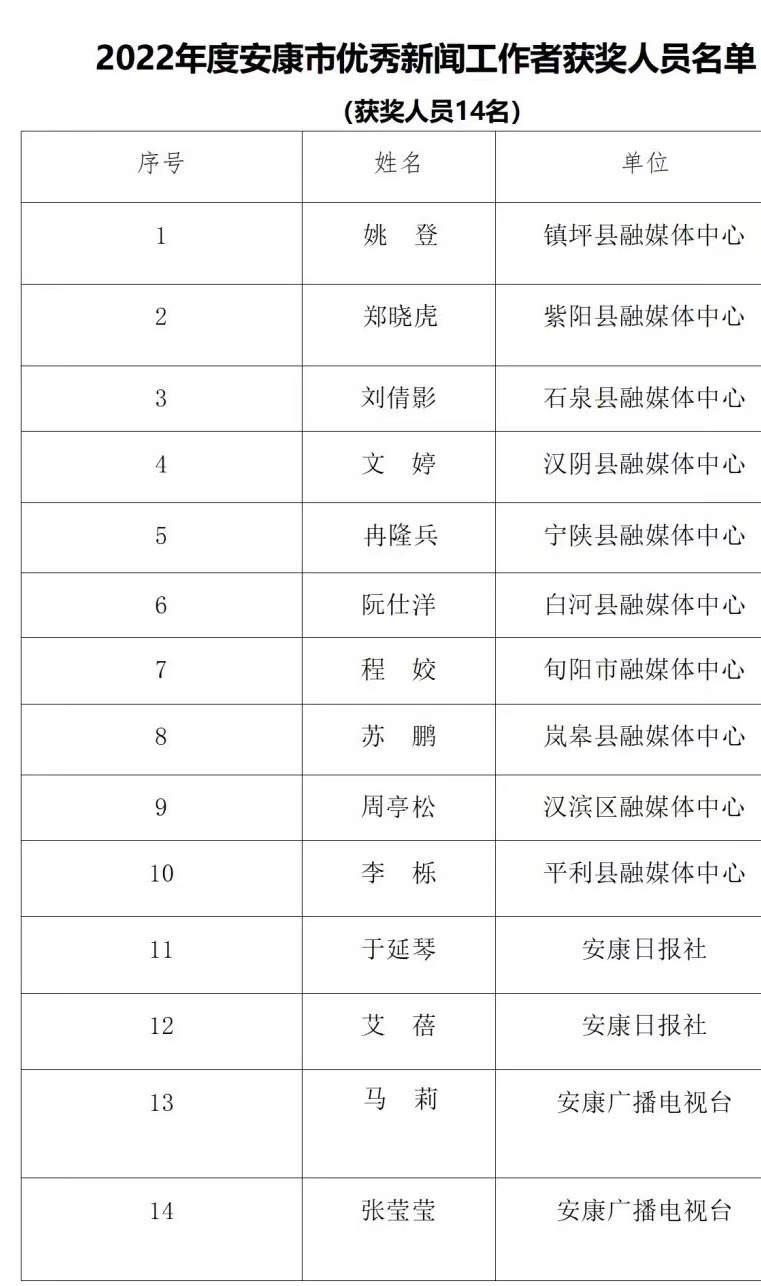 2022年度安康新聞獎(jiǎng)評(píng)審工作在中共安康市委宣傳部的指導(dǎo)下,由市記協(xié)具體組織實(shí)施,經(jīng)過(guò)各申報(bào)單位推薦、初審,市記協(xié)復(fù)審并組織專(zhuān)家定評(píng),評(píng)選出擬獲安康新聞獎(jiǎng)作品96件,其中一等獎(jiǎng)23件、二等獎(jiǎng)36件、三等獎(jiǎng)37件。擬授予姚登等14名同志“安康市優(yōu)秀新聞工作者”榮譽(yù)稱(chēng)號(hào)。