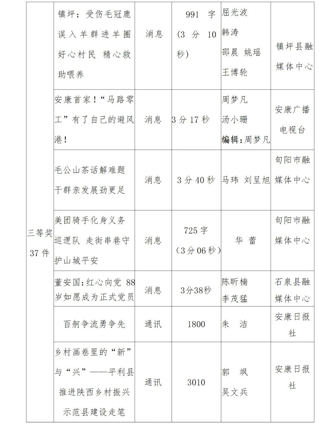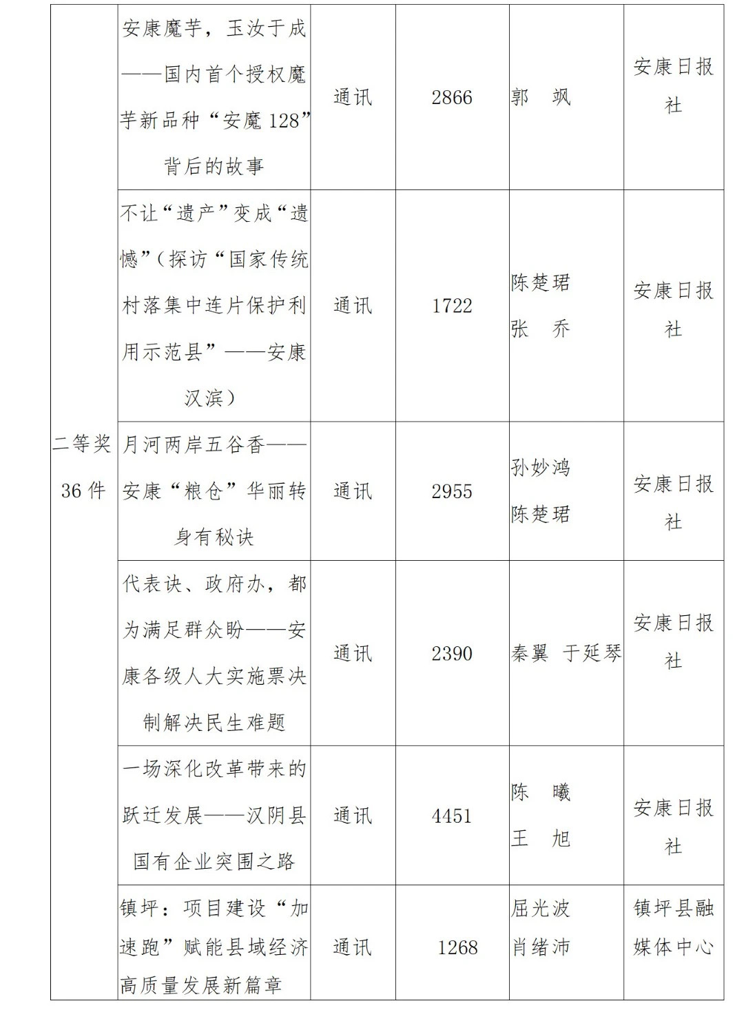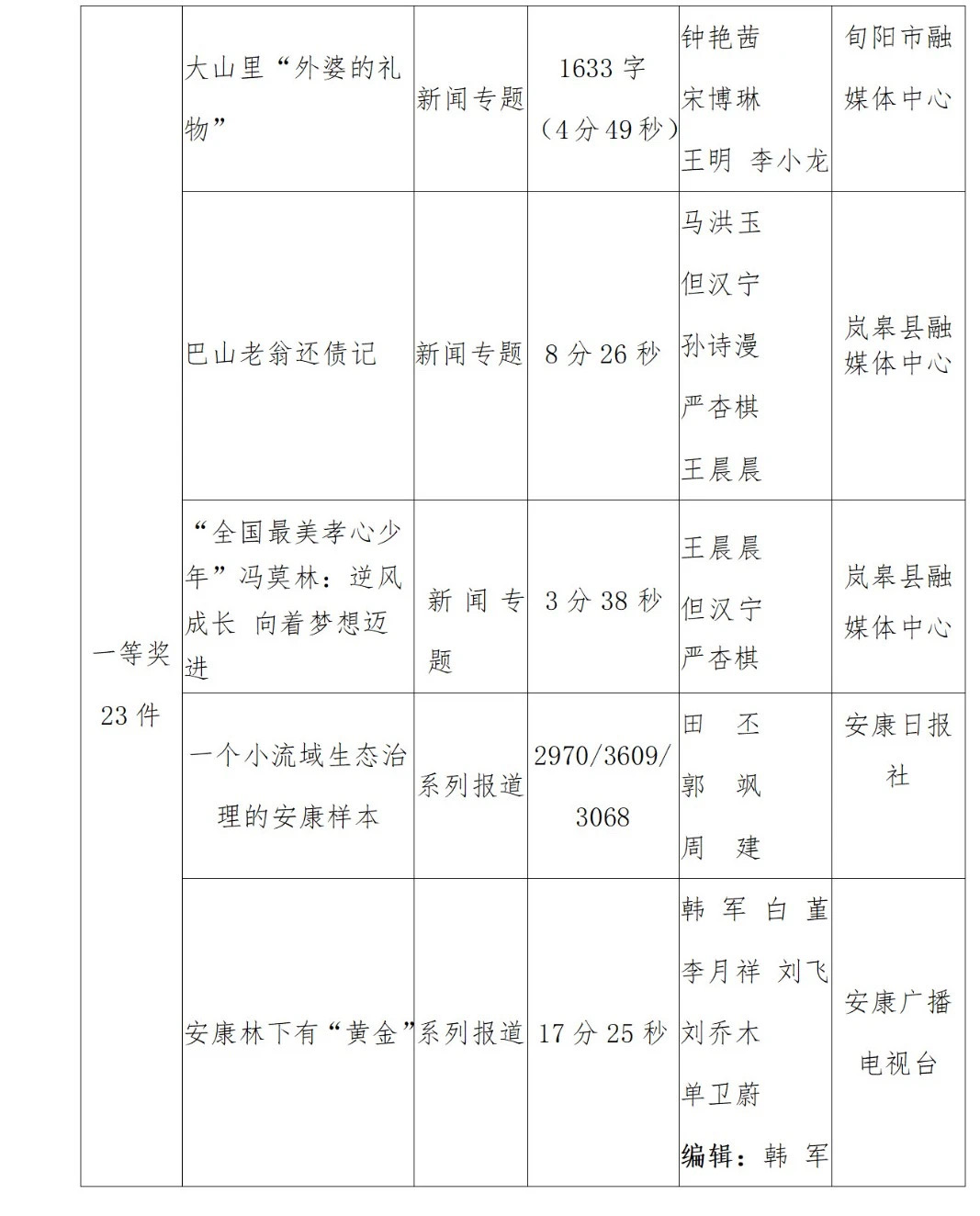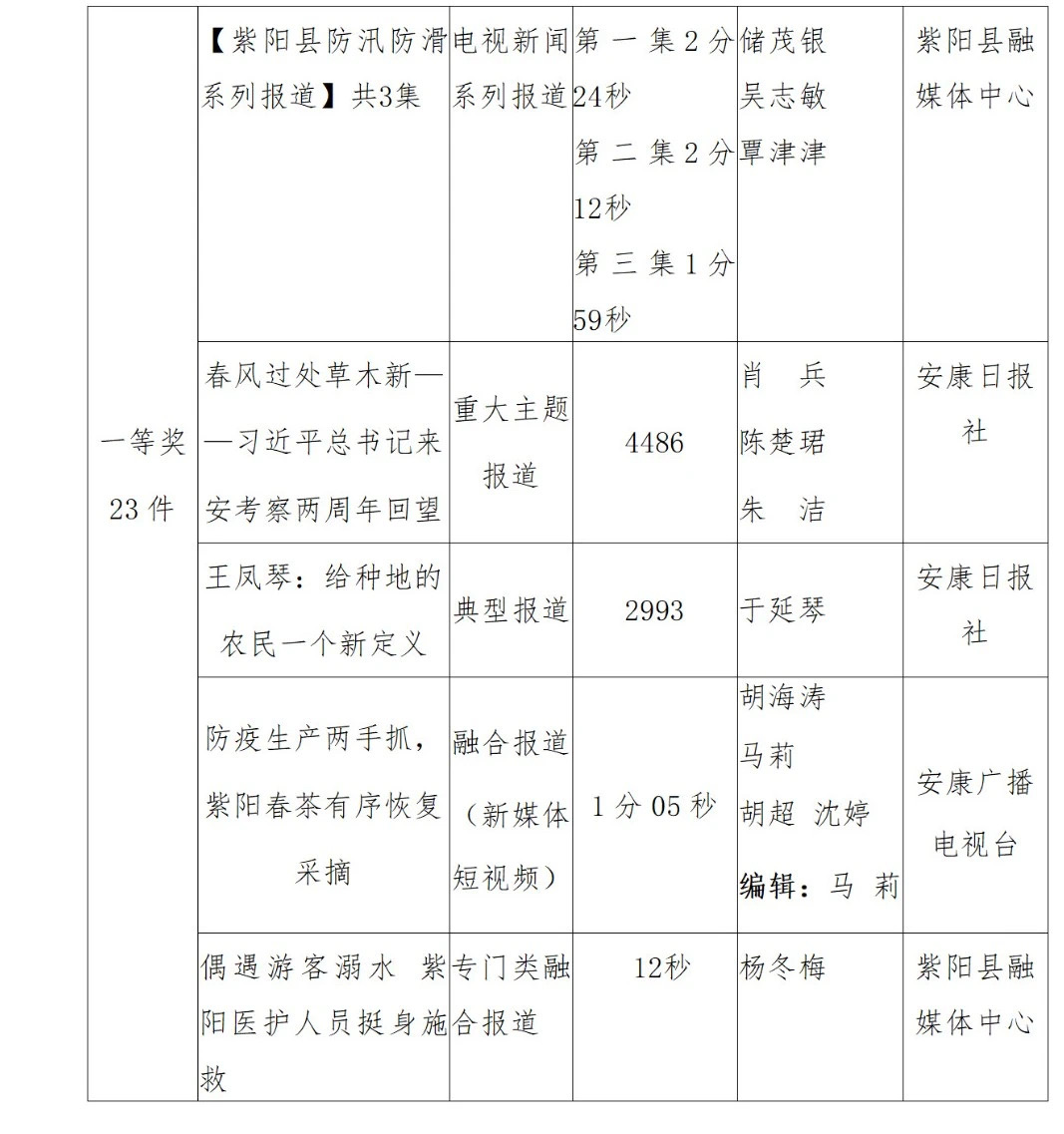 2022年度安康新聞獎(jiǎng)評(píng)審工作在中共安康市委宣傳部的指導(dǎo)下,由市記協(xié)具體組織實(shí)施,經(jīng)過(guò)各申報(bào)單位推薦、初審,市記協(xié)復(fù)審并組織專(zhuān)家定評(píng),評(píng)選出擬獲安康新聞獎(jiǎng)作品96件,其中一等獎(jiǎng)23件、二等獎(jiǎng)36件、三等獎(jiǎng)37件。擬授予姚登等14名同志“安康市優(yōu)秀新聞工作者”榮譽(yù)稱(chēng)號(hào)。