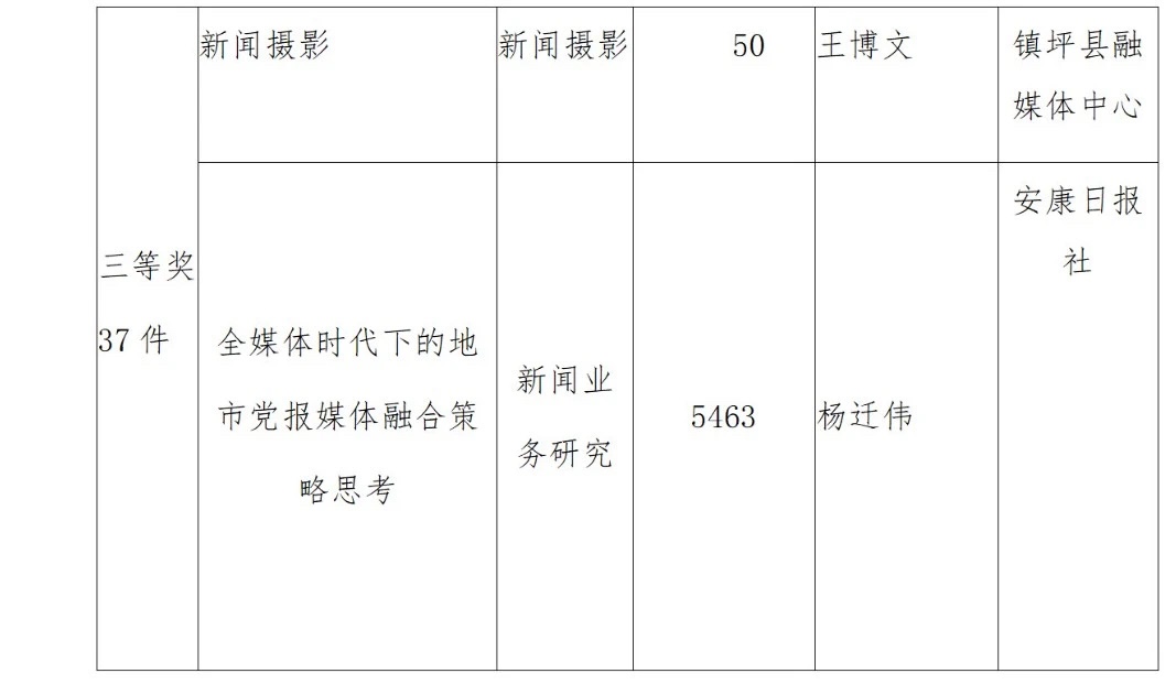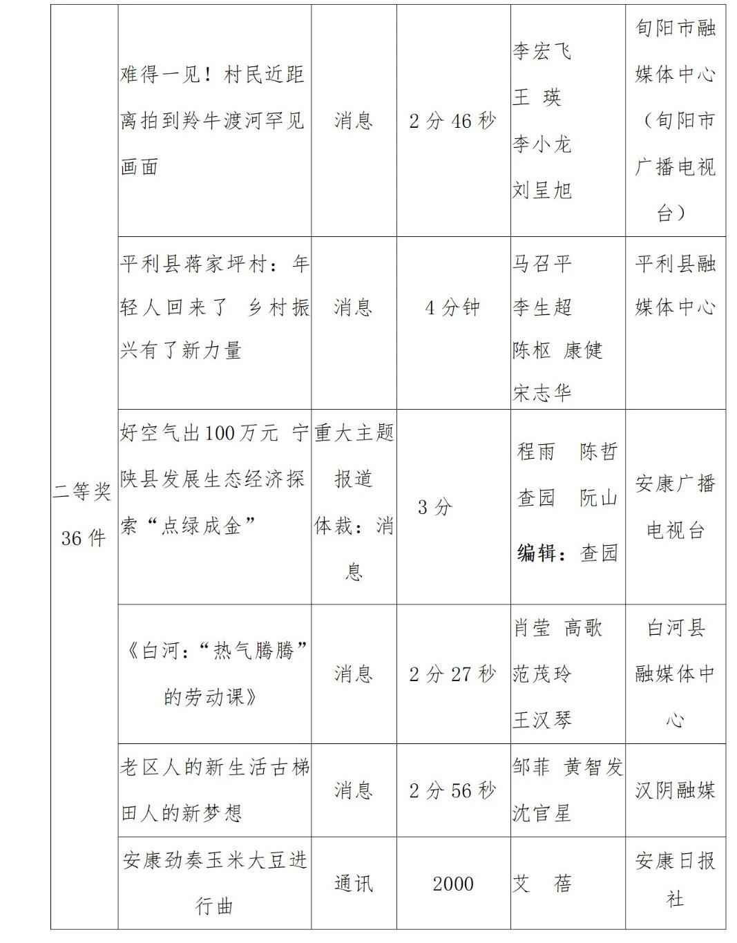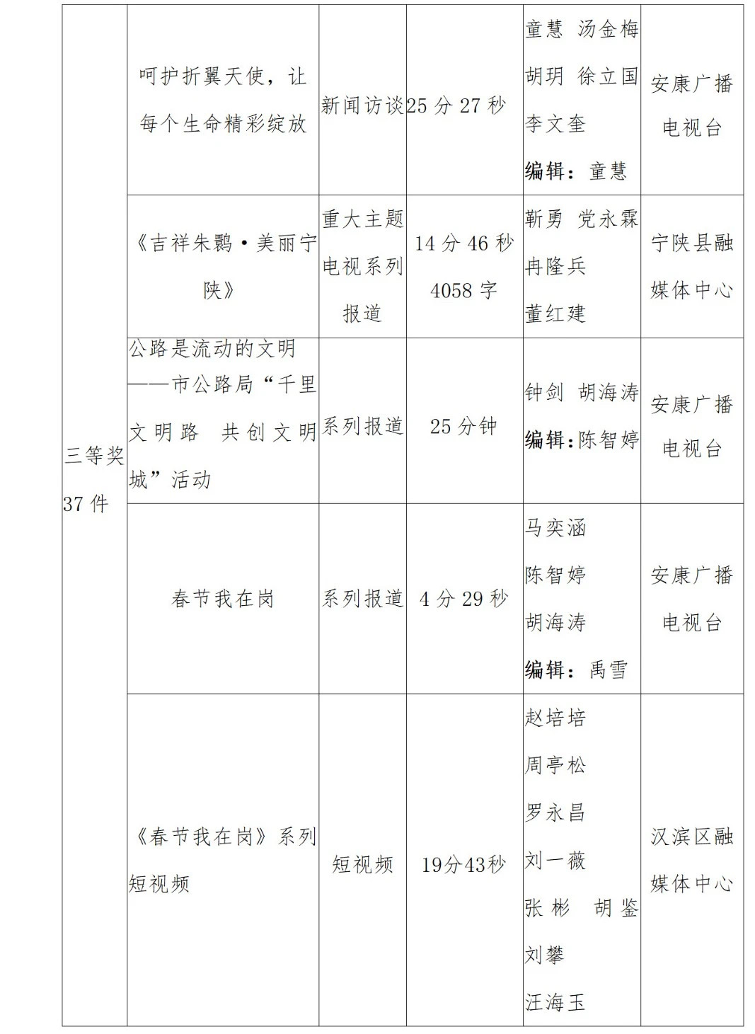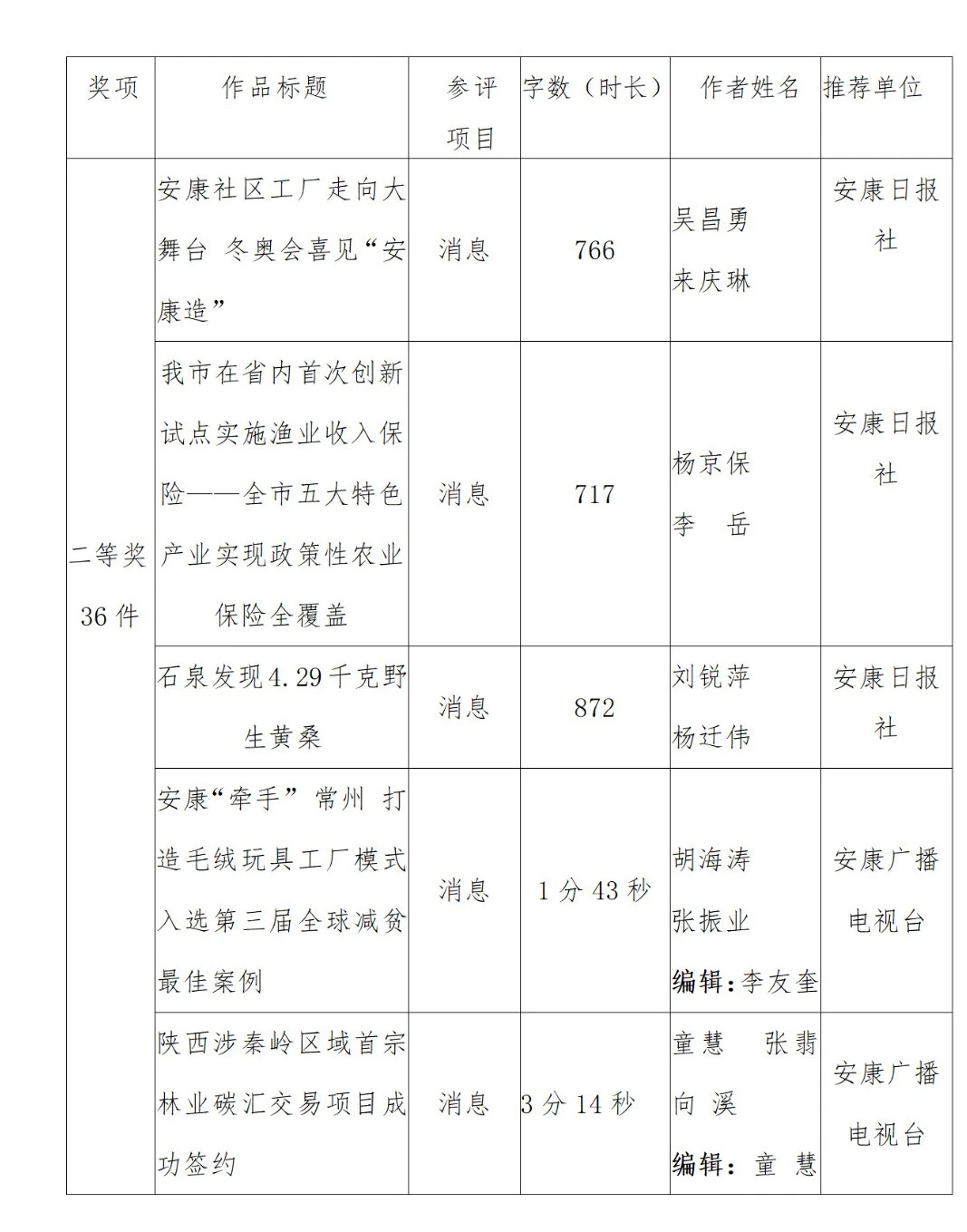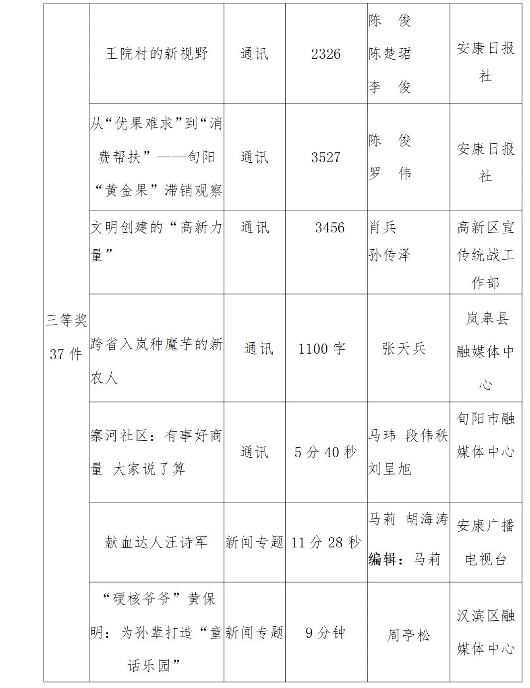 2022年度安康新聞獎(jiǎng)評(píng)審工作在中共安康市委宣傳部的指導(dǎo)下,由市記協(xié)具體組織實(shí)施,經(jīng)過(guò)各申報(bào)單位推薦、初審,市記協(xié)復(fù)審并組織專(zhuān)家定評(píng),評(píng)選出擬獲安康新聞獎(jiǎng)作品96件,其中一等獎(jiǎng)23件、二等獎(jiǎng)36件、三等獎(jiǎng)37件。擬授予姚登等14名同志“安康市優(yōu)秀新聞工作者”榮譽(yù)稱(chēng)號(hào)。