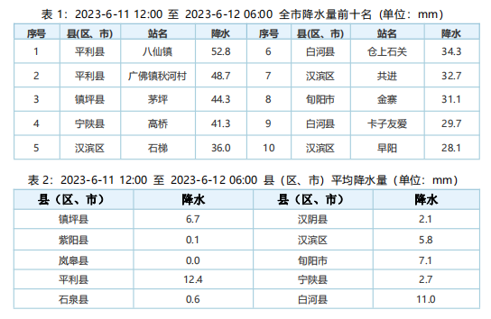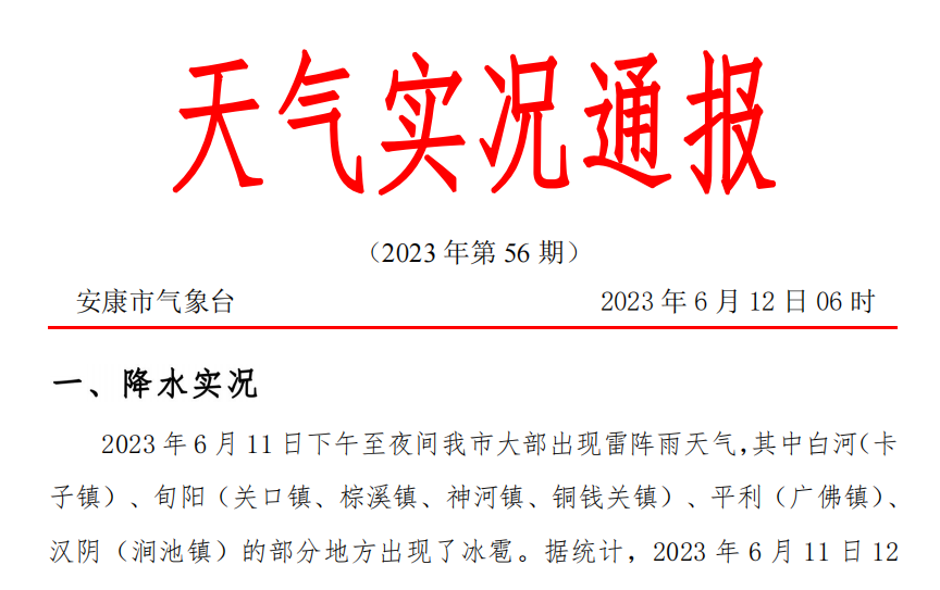 2023年6月11日下午至夜間我市大部出現(xiàn)雷陣雨天氣,其中,白河(卡子鎮(zhèn))、旬陽(關(guān)口鎮(zhèn)、棕溪鎮(zhèn)、神河鎮(zhèn)、銅錢關(guān)鎮(zhèn))、平利(廣佛鎮(zhèn))、漢陰(澗池鎮(zhèn))的部分地方出現(xiàn)了冰雹。據(jù)統(tǒng)計(jì),2023年6月11日12時(shí)至6月12日06時(shí)安康市平均雨量為4.6毫米,其中單站雨量最大為平利八仙氣象監(jiān)測(cè)站52.8毫米,縣市平均雨量最大為平利縣12.4毫米,最大小時(shí)雨強(qiáng)出現(xiàn)在平利廣佛鎮(zhèn)秋河村氣象監(jiān)測(cè)站43.4毫米(6月11日17時(shí)至18時(shí)),共有154個(gè)氣象監(jiān)測(cè)站出現(xiàn)了降雨(大于0.1毫米),10毫米以上有50站,25毫米以上有14站,50毫米以上有1站。安康氣象監(jiān)測(cè)站4.3毫米。