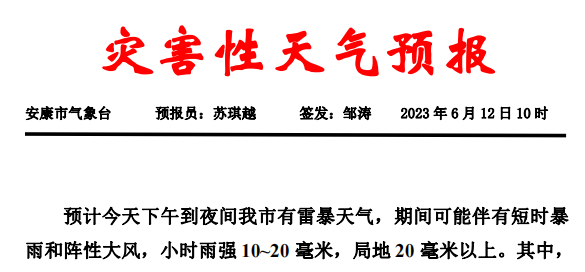 預(yù)計(jì)今天下午到夜間我市有雷暴天氣,期間可能伴有短時(shí)暴雨和陣性大風(fēng),小時(shí)雨強(qiáng)10~20毫米,局地20毫米以上。其中,旬陽、白河、嵐皋、平利、鎮(zhèn)坪局部可能出現(xiàn)冰雹。