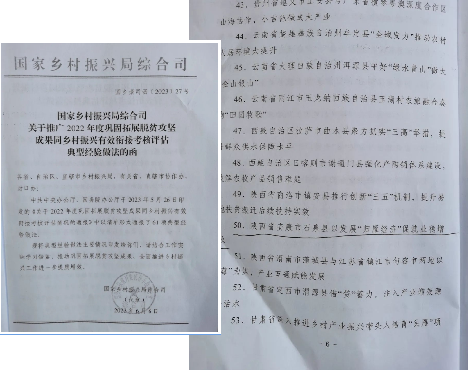 5月26日,由中共中央辦公廳、國務(wù)院辦公廳印發(fā)的《關(guān)于2022年度鞏固拓展脫貧攻堅(jiān)成果同鄉(xiāng)村振興有效銜接考核評估情況的通報》中,以清單形式通報了61項(xiàng)典型經(jīng)驗(yàn)做法,其中“安康市石泉縣以發(fā)展‘歸雁經(jīng)濟(jì)’促就業(yè)穩(wěn)增收”成功入選。