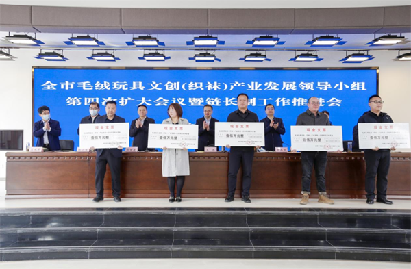 2022年10月18日,全市毛絨玩具文創(chuàng)(織襪)產(chǎn)業(yè)發(fā)展領(lǐng)導(dǎo)小組第四次擴大會議上表彰兌現(xiàn)了一次性獎補資金1000萬元