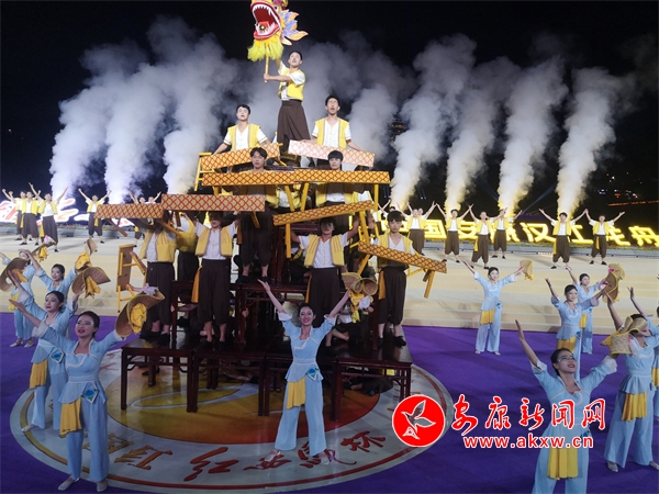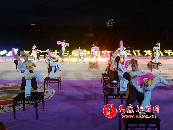 熠熠燈輝“靚”漢江,南北歌舞“響”安康。演出活動(dòng)以絢麗奪目的燈光秀《華彩漢江》開場,漢江兩岸五光十色的燈光隨著音樂的節(jié)律不斷變換、舞動(dòng),使一江兩岸美輪美奐,《安安康康鬧龍舟》通過“毛絨玩具”的親切問候和載歌載舞,展現(xiàn)了安康新毛絨玩具產(chǎn)業(yè)蓬勃發(fā)展的動(dòng)力和生機(jī),具有地方特色的民族舞蹈《方寸之間》,將安康的傳統(tǒng)藝術(shù)與時(shí)代特色緊密結(jié)合,舞出了了安康人民在新時(shí)代表現(xiàn)出的新風(fēng)貌,原汁原味的陜南陜北民歌對唱,讓粗狂和婉約在漢水之濱進(jìn)行完美約會(huì),歌舞、獨(dú)唱、漢劇、雜技《南木有禾》《荷韻漢江》《節(jié)日歡歌》《魅力安康》《環(huán)之舞》《端午安康》等節(jié)目,以獨(dú)特的唱腔、曼妙的舞姿和獨(dú)特的技藝全方位的展現(xiàn)了漢水傳統(tǒng)文化的魅力和安康人民的精神追求,熱情激昂的歌舞《端午安康》演繹出了漢水兒女對聚力建設(shè)幸福安康的美好祝愿和對未來幸福美好生活的向往。