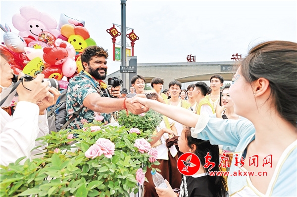 6月22日,來自印度的游客Ramm在觀看完龍舟節(jié)開幕式后與演職人員合影。記者 潘潤(rùn)生 攝
